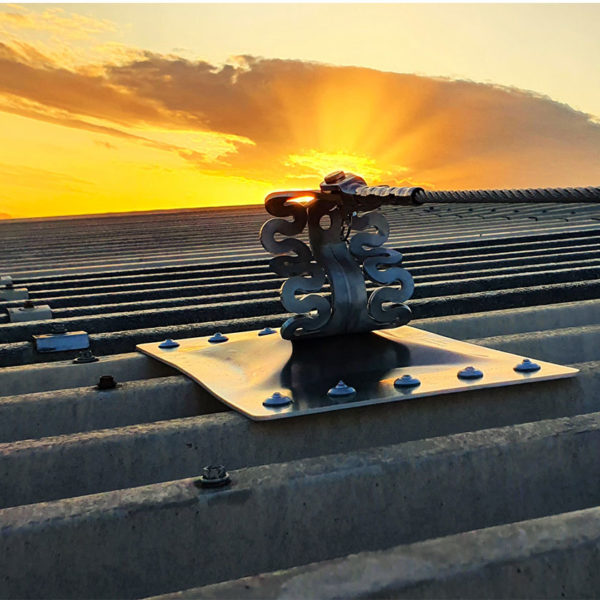 A horizontal lifeline system designed to be mounted onto a metal roof.